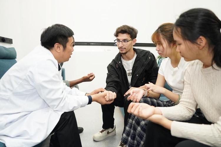 Pan Yinxing (1st L), a lecturer from Anhui University of Chinese Medicine, teaches international students to take the patient's pulse at Anhui University of Chinese Medicine in Hefei, east China's Anhui Province, Oct. 16, 2025. (Xinhua/Du Yu)
